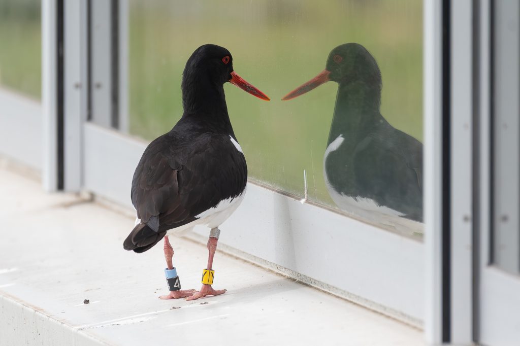 Foto 2: Scholekster BLP-B4YY (man) verdedigt zijn territorium tegen zijn eigen spiegelbeeld. De vogels die dit veelvuldig doen zijn vaak vogels die ook reageren op een lokvogel. Zo kon ook deze vogel gevangen worden.