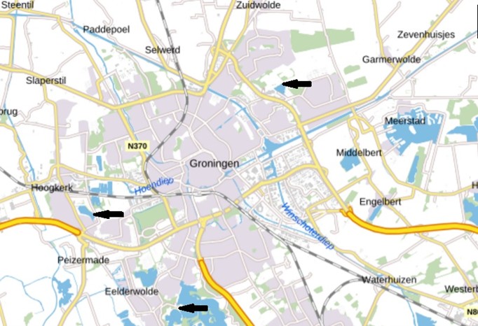 Figuur 2. Soos/slaapplaats Kardinge aan noordoostzijde van de stad Groningen en de twee andere grote sozen/slaapplaatsen langs de stadsrand, namelijk Ruskenveenseplas ten westen van de stad (7 km tot Kardinge) en Hoornse Meer ten zuiden van de stad (7,5 km tot Kardinge).